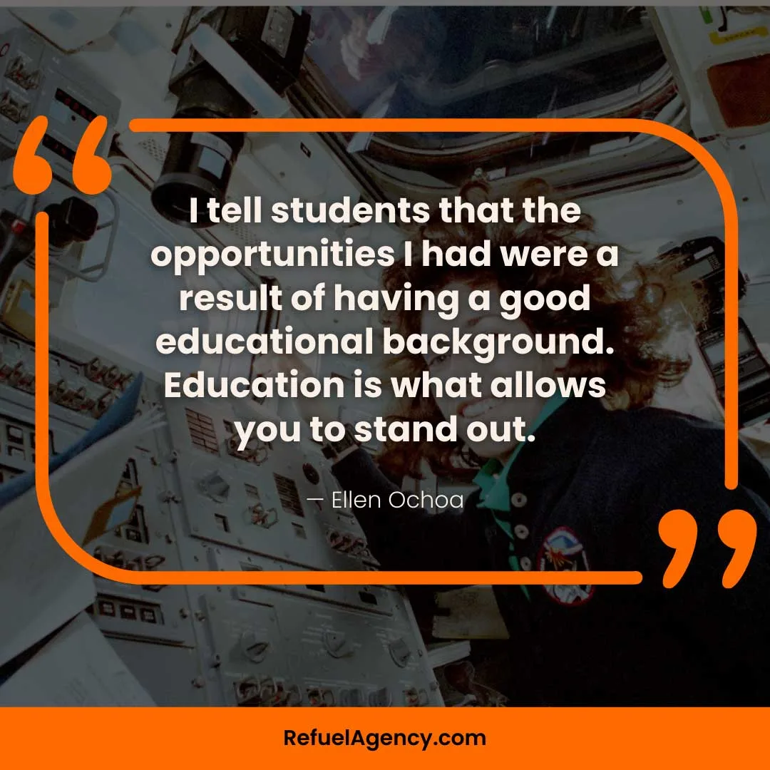 - “I tell students that the opportunities I had were a result of having a good educational background. Education is what allows you to stand out.”— Ellen Ochoa (first Hispanic woman in space)
