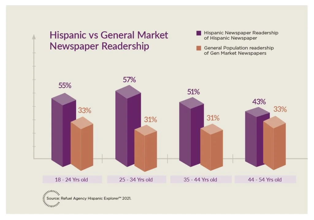 The first trend we noticed is consumer trust—and where it’s placed. In our latest research study, Refuel Agency found a significant increase in Hispanic consumer’s trust of print media since 2017. Our results show that Hispanic newspaper readership remained constant at 52% but newspaper trust has increased by 40% compared to 2017. Authenticity and traditional values are important to this audience, and that means supporting their local community and Hispanic-owned businesses. Print, because of its in-community nature, can do that exceptionally well. In contrast, trust for social media and websites went down in the past four years.